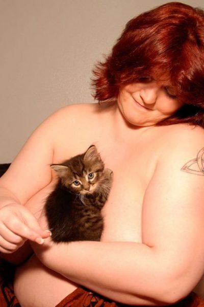 Cute BBW laying naked on her side with her fat naked belly hanging out stroking her pussy cat